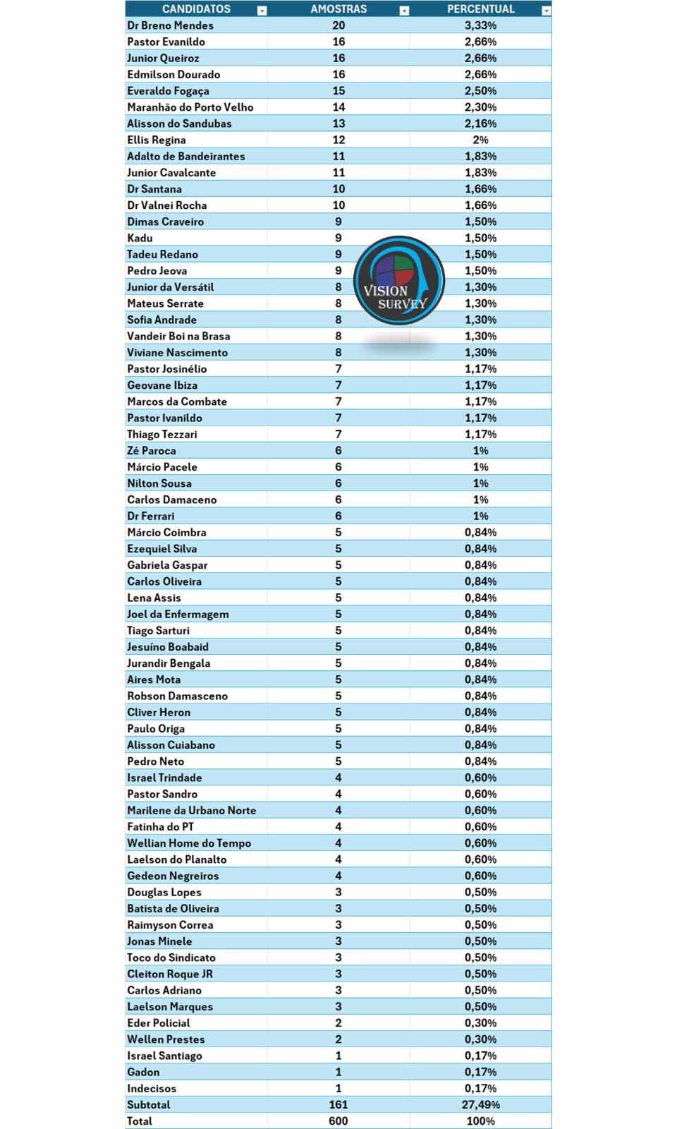 Se a eleição fosse hoje, os 23 mais votados seriam: Dr. Breno Mendes (3,33%), Pastor Evanildo, Junior Queiroz, e Edimilson Dourado, empatados com 2,66%, Everaldo Fogaça (2,50%), Maranhão do Porto Velho (2,30%), Alisson do Sanduba´s (2,16%), Ellis Regina (2,0%); Mais abaixo, empatados com 1,83% vem: Adalto do Bandeirantes e Junior Cavalcante; Dr. Santana e Dr. Vanei Rocha estão empatados com 1,66%; Empatados com 1,50% estão Dimas Craveiro, Kadu, Tadeu Redano e Pedro Jeová; Em Seguida, com 1,30% estão empatados, Junior da Versátil, Mateus Serrate, Sofia Andrade, Vandeir Boi na Brasa e Viviane Nascimento; e, Por último, Pastor Josinélio, Geovane Ibiza, Marcos da Combate, Pastor Ivanildo, e Thiago Tezzari.