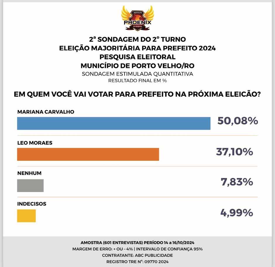 No novo levantamento do Instituto Phoenix, divulgado nesta quarta-feira (16), Mariana Carvalho aparece com 50,08% das intenções de votos, contra 37,10% do candidato Leo Moraes, mantendo um cenário estabilizado em relação à pesquisa anterior, divulgada no último domingo (13).