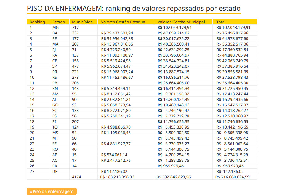 PISO DA ENFERMAGEM: ranking de valores repassados por estado