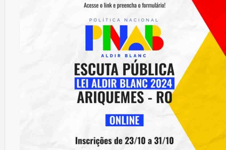 Olá artista de Ariquemes Você é nosso convidado para participar da Escuta Pública sobre a Lei Aldir Blanc! Este é um espaço importante para que a comunidade possa compartilhar suas experiências, sugestões e reflexões sobre a aplicação da lei e seu impacto na cultura local.