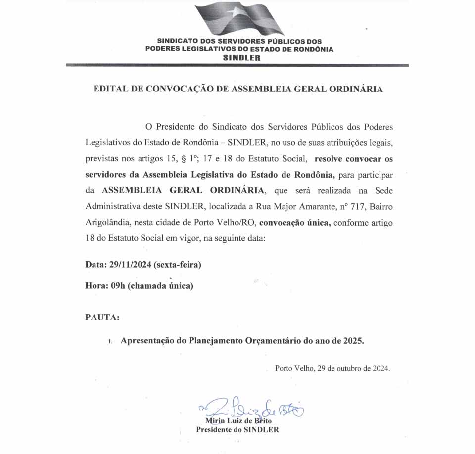 O Sindicato dos Servidores Públicos dos Poderes Legislativos do Estado de Rondônia (SINDLER) convoca seus membros para a Assembleia Geral Ordinária. O encontro acontecerá no dia 29 de novembro de 2024, às 9h, na sede administrativa do sindicato em Porto Velho. Na pauta, a apresentação do planejamento orçamentário para o ano de 2025.