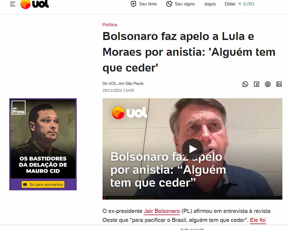 Bolsonaro faz apelo a Lula e Moraes por anistia: 'Alguém tem que ceder'