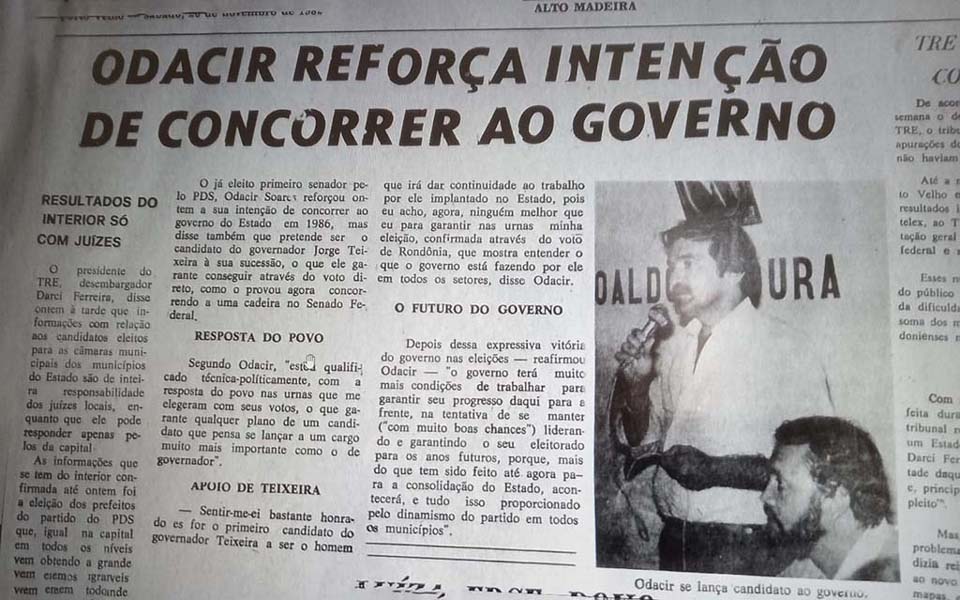1982 - Primeiro senador eleito pelo Estado, na única vaga de mandato de 8 anos, Odacir Soares anuncia sua candidatura ao governo em 1986.