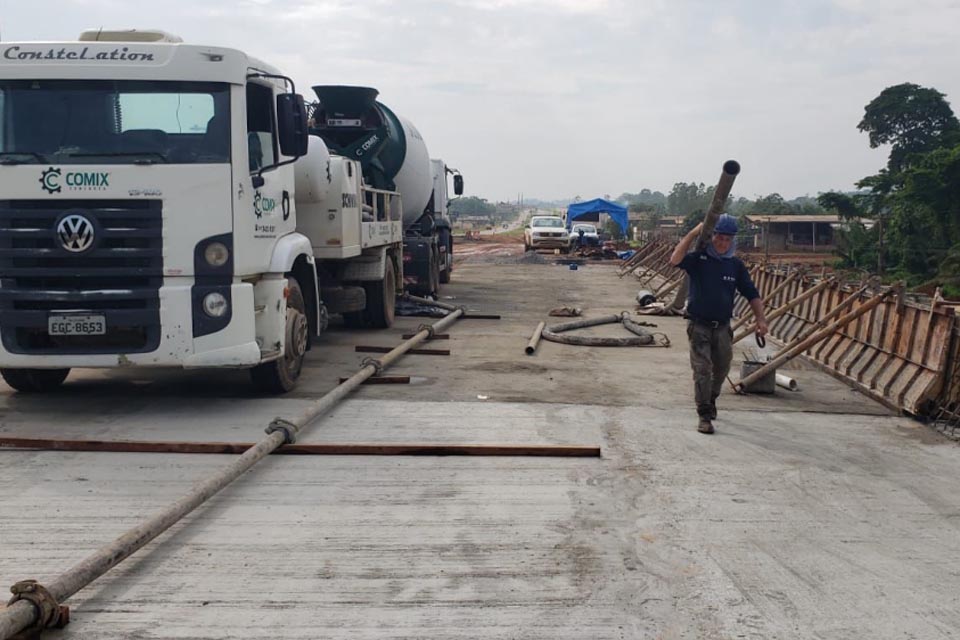 A construção da nova ponte sobre o Rio Jaru entra em sua fase final com o início da concretagem, marcando um passo importante para a conclusão dessa obra tão aguardada pela população. Após a preparação da ferragem sobre a estrutura, a aplicação do concreto consolida o avanço do projeto, que promete trazer mais segurança e eficiência no tráfego da região.
