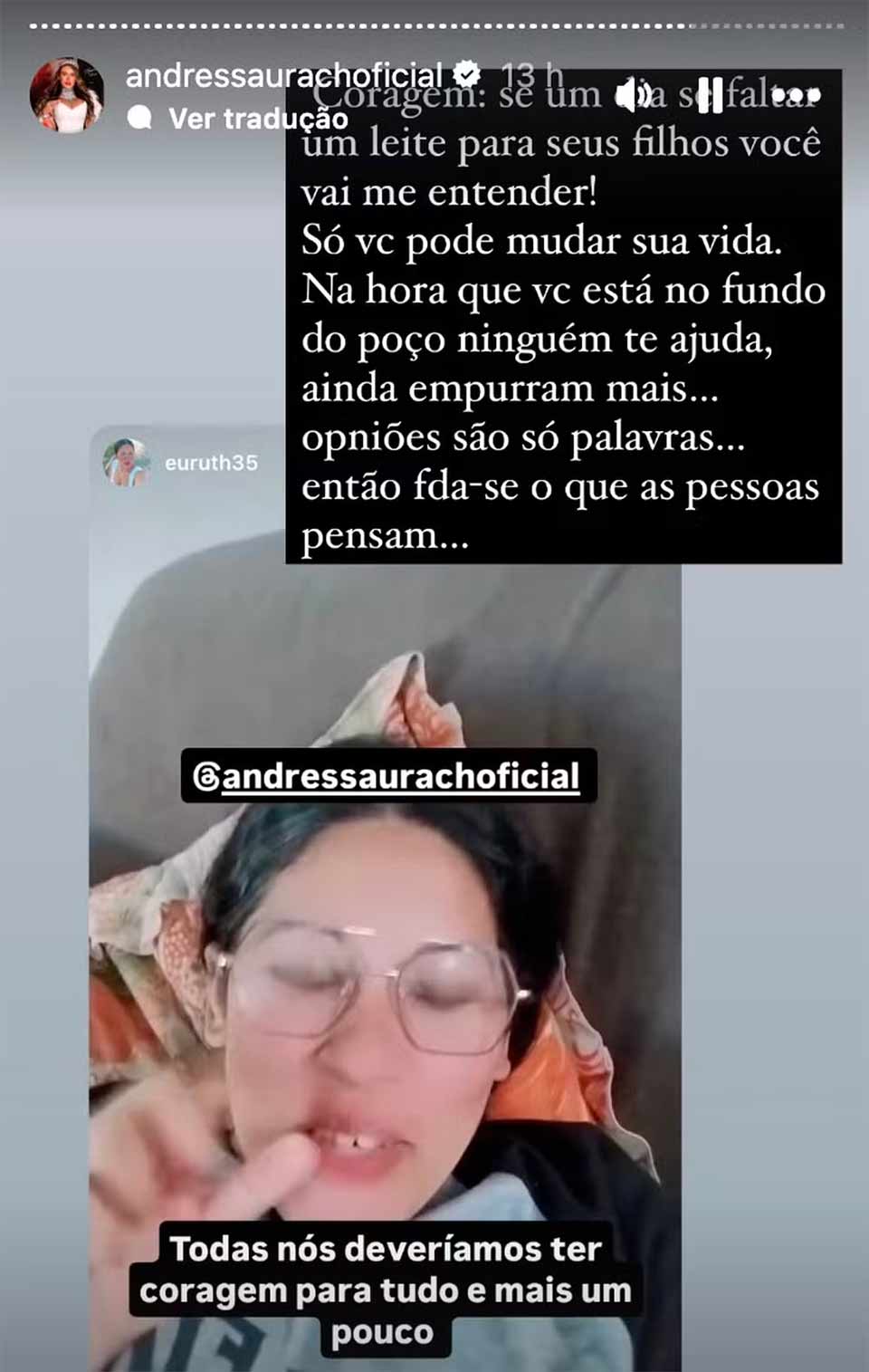 “Coragem: Se um dia faltar um leite para os seus filhos, você vai me entender. Só você pode mudar a sua vida. Na hora que você está no fundo do poço, ninguém te ajuda, ainda empurram mais”, disparou ela.