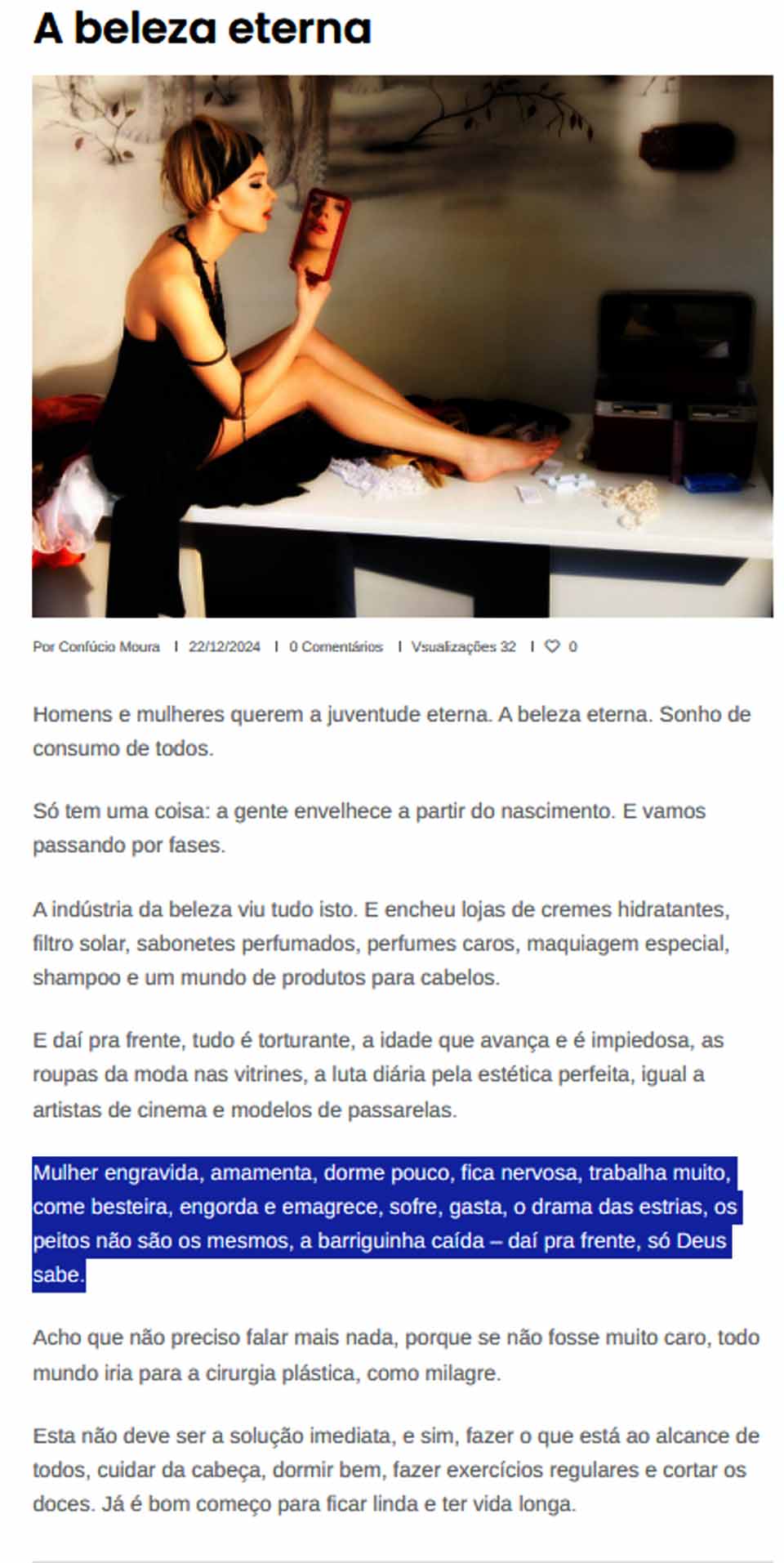 Porto Velho, RO – O senador por Rondônia, Confúcio Moura (MDB), publicou no último domingo, 22, um texto intitulado "A beleza eterna", no qual discorre sobre os desafios associados ao envelhecimento, com foco nas transformações físicas e emocionais enfrentadas pelas mulheres.