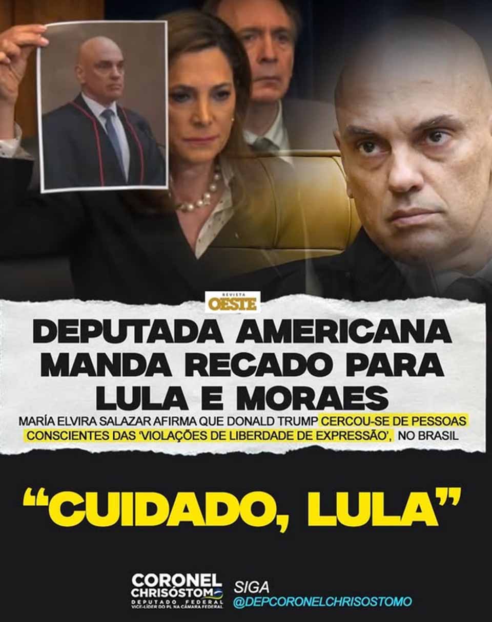 Chrisóstomo, ao replicar a fala da deputada, reforçou o tom do discurso com uma mensagem direta ao presidente brasileiro: “Cuidado, Lula. Este é o recado que a deputada dos EUA, María Salazar deu ao Barbudinho”. O parlamentar também destacou outra fala da deputada americana, que teria alertado que “alguns ministros do STF considerados ‘inimigos da liberdade de expressão’ no Brasil” foram alvos de críticas nos Estados Unidos.