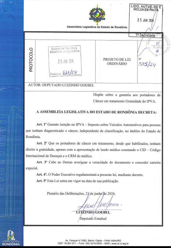 O crescente e preocupante número de pacientes rondonienses diagnosticados com os mais diversos tipos de câncer levou o deputado estadual Luizinho Goebel (Podemos) a apresentar na Assembleia Legislativa o Projeto de Lei Ordinária 535/2024, que garante isenção no IPVA para pessoas que tenham sido diagnosticadas com câncer, independente de classificação, no estado de Rondônia.