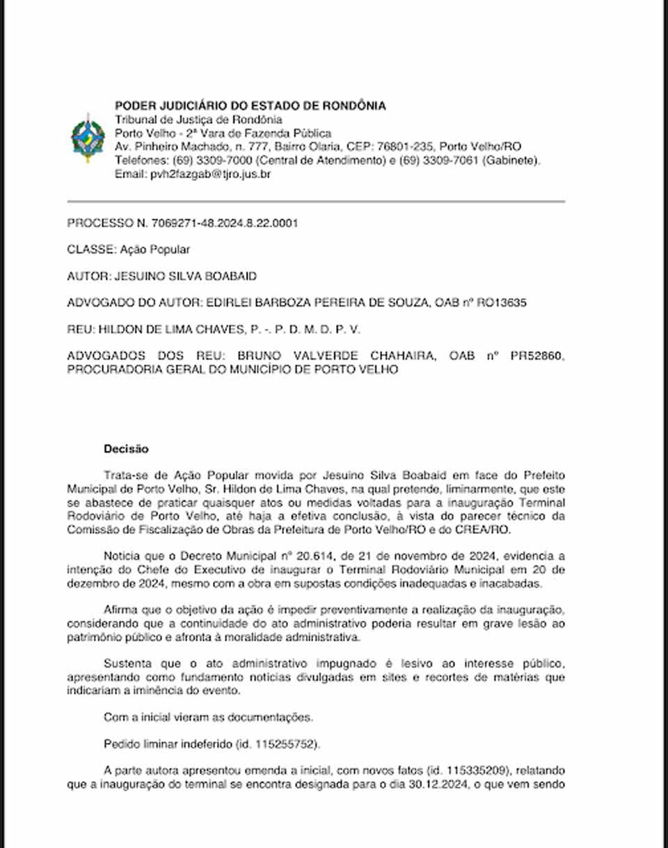 A ação foi movida pelo ex-deputado estadual Jesuíno Boabaid contra o prefeito de Porto Velho, Hildon Chaves, do PSDB, apontando que o Terminal Rodoviário estaria em condições inadequadas para inauguração. O autor alegou que o decreto municipal nº 20.614, de 21 de novembro de 2024, prevendo a entrega da obra no dia 20 de dezembro, afrontaria a moralidade administrativa e colocaria em risco o patrimônio público. Após indeferimento inicial do pedido de urgência, novos fatos foram apresentados, incluindo a previsão de inauguração para 30 de dezembro.