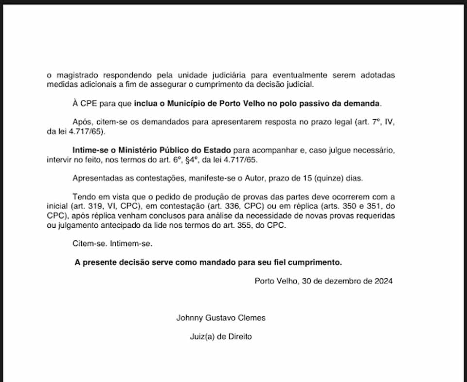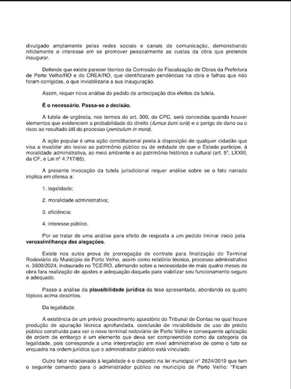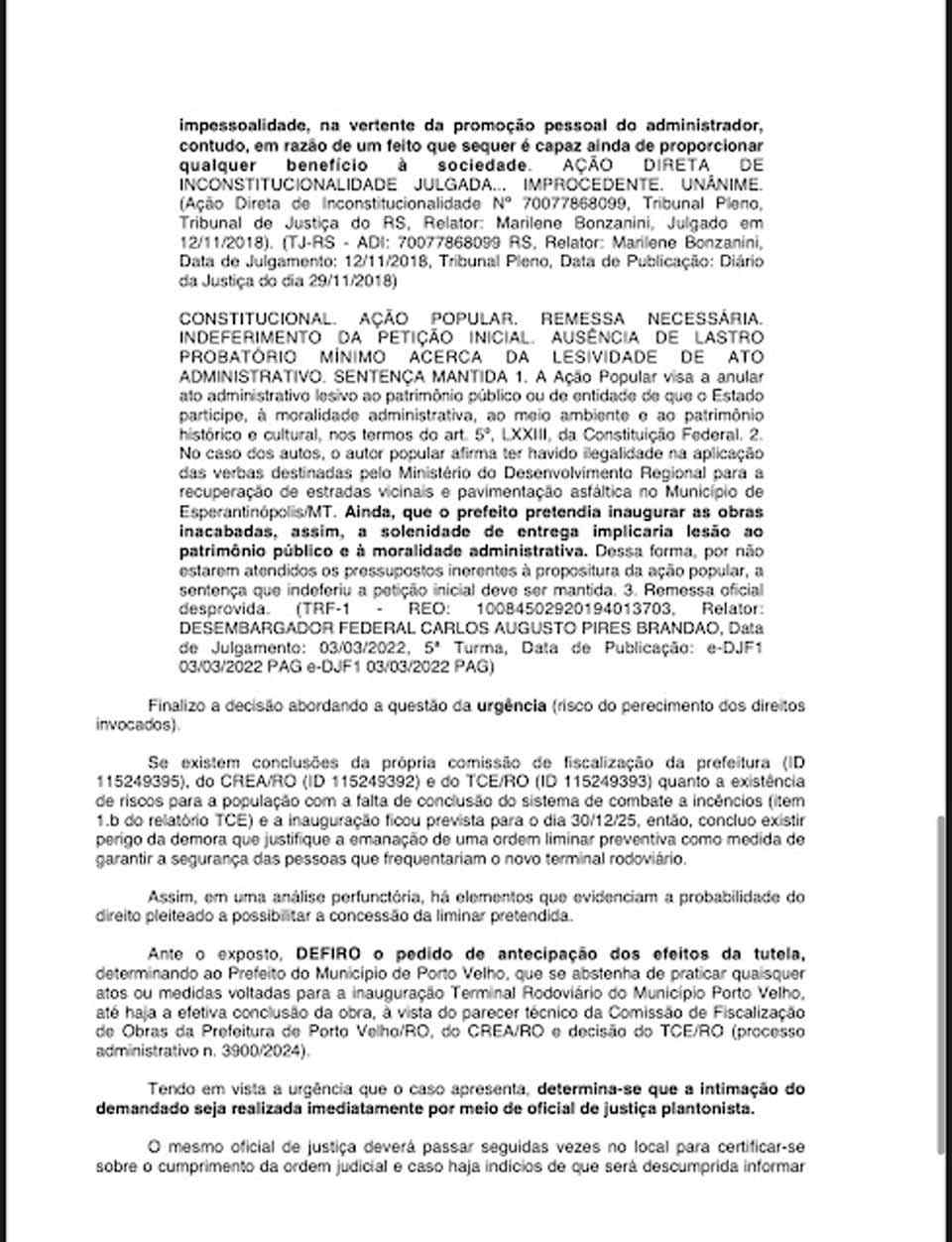 O juízo determinou que a Prefeitura de Porto Velho se abstenha de realizar qualquer ato voltado à inauguração do Terminal Rodoviário até que sejam apresentados laudos técnicos que atestem a conclusão das obras e a segurança do local. O prefeito também foi intimado a se manifestar no prazo legal, sob pena de responsabilização judicial em caso de descumprimento.
