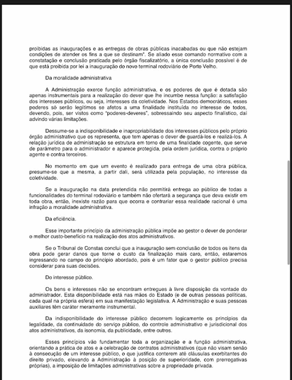 De acordo com o Ministério Público, permitir a inauguração em condições não ideais representaria uma infração aos princípios da legalidade, moralidade administrativa, eficiência e interesse público. “O ato administrativo não pode se sobrepor à segurança e ao uso efetivo por parte da população”, pontuou o MP/RO em sua manifestação.