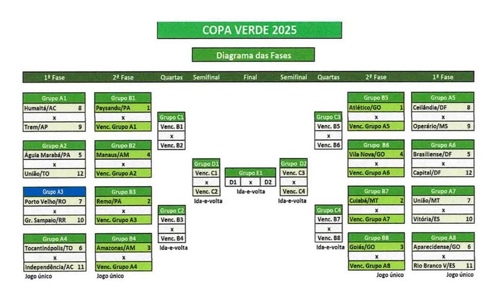A Confederação Brasileira de Futebol divulgou os confrontos da primeira fase da Copa Verde 2025, assim como os adversários dos classificados na fase inicial na segunda fase da competição. Os jogos da primeira e segunda fase acontecem em jogo único.
