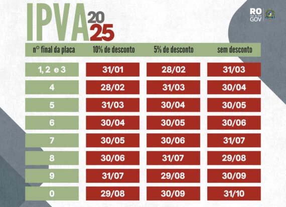 O governo de Rondônia publicou o calendário de pagamento do Imposto sobre a Propriedade de Veículos Automotores (IPVA) para 2025. De acordo com a Secretaria de Estado de Finanças (Sefin), o cronograma segue o padrão de organização baseado no último dígito da placa dos veículos, com o primeiro vencimento em março. Os contribuintes que optarem por antecipar o pagamento, poderão aproveitar os descontos. Mais informações sobre o IPVA 2025 estão disponíveis no site da Agência Virtual da Sefin.