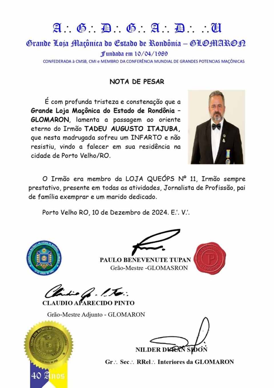 O jornalista será lembrado por sua contribuição ao desenvolvimento da comunicação digital em Rondônia e por sua atuação marcante na sociedade. A GLOMARON, por meio de suas lideranças, destacou que o “irmão” Tadeu agora encontra-se no Oriente Eterno, deixando um legado de integridade e trabalho árduo.3