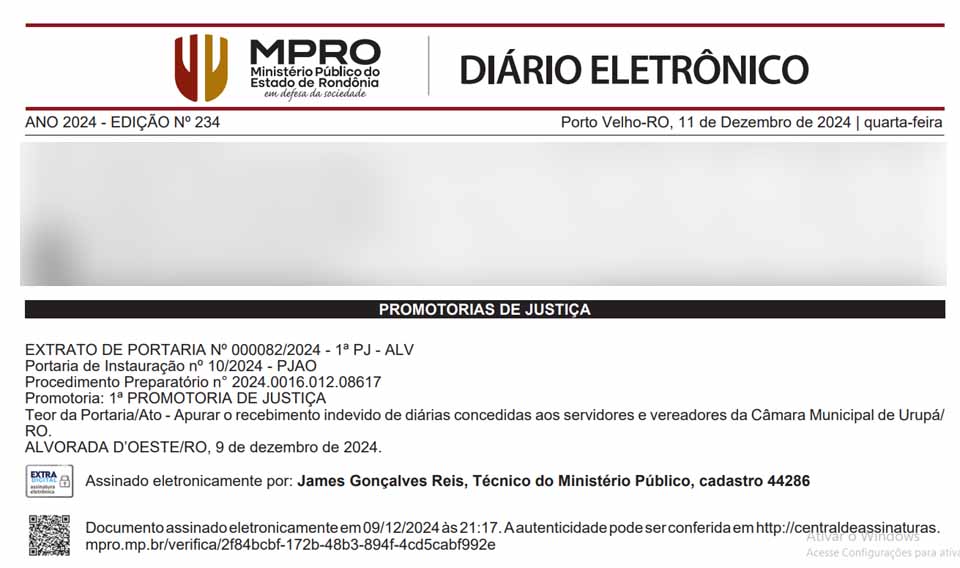 Um dos destaques é a instauração de procedimento preparatório pela 1ª Promotoria de Justiça de Alvorada D’Oeste para investigar o recebimento indevido de diárias por servidores e vereadores da Câmara Municipal de Urupá. O procedimento está registrado na Portaria nº 000082/2024, assinada eletronicamente em 9 de dezembro de 2024, e busca angariar elementos para possíveis medidas administrativas ou judiciais cabíveis.