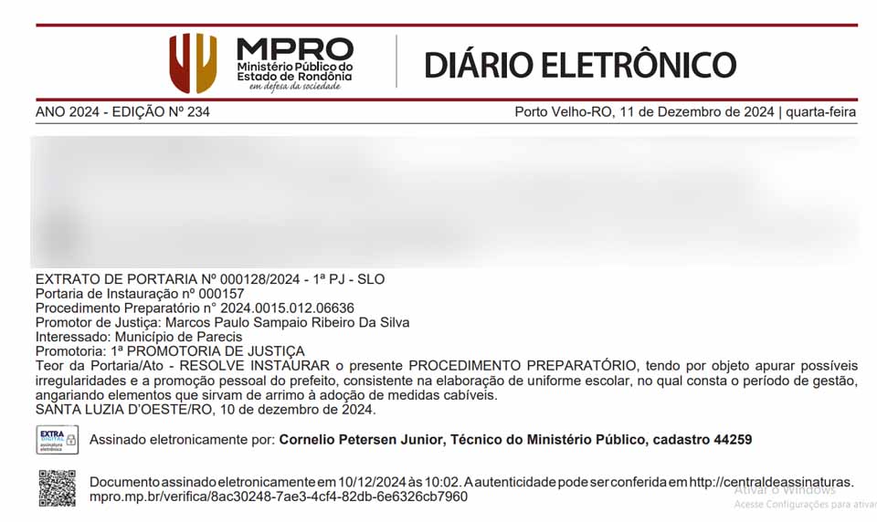 Outro ponto de relevância é a instauração do Procedimento Preparatório nº 2024.0015.012.06636, pela 1ª Promotoria de Justiça de Santa Luzia D’Oeste. O caso investiga a inclusão de informações sobre a gestão do prefeito em uniformes escolares, prática que pode configurar promoção pessoal irregular. De acordo com o promotor Marcos Paulo Sampaio Ribeiro da Silva, responsável pelo caso, o objetivo é reunir elementos para ações pertinentes. A portaria foi assinada em 10 de dezembro.