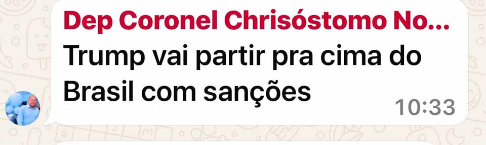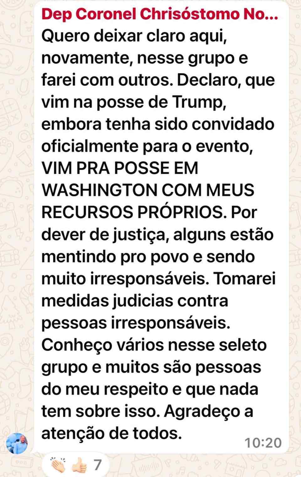Porto Velho, RO – O deputado federal Coronel Chrisóstomo (PL-RO) manifestou-se em um grupo de debate político no WhatsApp, afirmando que tomará medidas judiciais contra aqueles que considera responsáveis por propagar informações falsas sobre sua participação na posse do presidente dos Estados Unidos, Donald Trump.