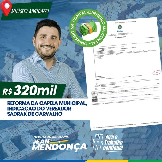 "Atendendo à solicitação do vereador Sandrak de Carvalho, destinei R$ 320 mil para a reforma e adequação de um prédio público em Ministro Andreazza, que será transformado na capela mortuária municipal. O recurso já está disponível na conta da prefeitura para iniciar as obras", explicou o parlamentar.