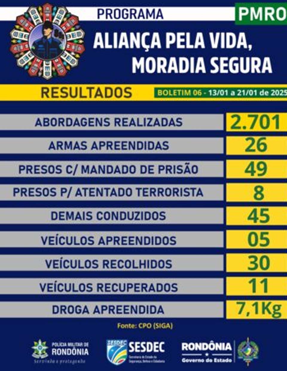 O governo de Rondônia divulgou, nesta quarta-feira (22), o balanço das ações de segurança pública. Os esforços integram uma ampla estratégia para intensificar o enfrentamento à criminalidade, desarticular grupos criminosos e garantir a segurança dos cidadãos em todo o estado.