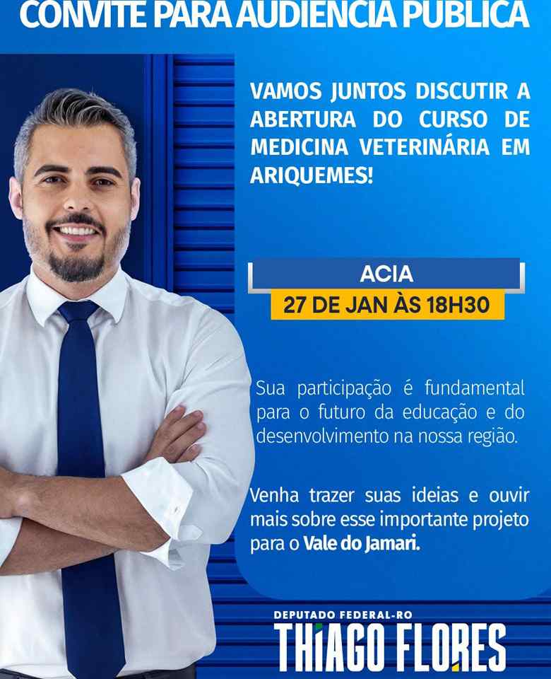O deputado federal Thiago Flores (Republicanos) convida toda a população de Ariquemes e região para participar de uma importante Audiência Pública que debaterá a abertura do curso de Medicina Veterinária no campus do Instituto Federal de Rondônia (IFRO), localizado em Ariquemes.