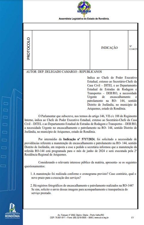 Por meio da Indicação nº 11144/2025, o Deputado Delegado Camargo encaminhou ao Governo do Estado e ao Departamento de Estradas de Rodagem de Rondônia (DER/RO) uma solicitação urgente para a realização de serviços de encascalhamento e patrolamento na RO-144, especificamente no trecho que dá acesso ao Distrito de Joelândia, no município de Ariquemes.