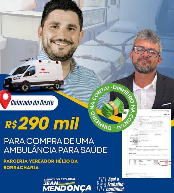 O deputado estadual Jean Mendonça (PL) confirmou a liberação de R$ 290 mil para a compra de uma ambulância destinada à Secretaria Municipal de Saúde de Colorado do Oeste. O recurso, que já se encontra na conta da prefeitura, foi destinado após pedido do vereador Hélio da Borracharia (PL), que destacou a importância do veículo para o transporte de pacientes que necessitam de atendimento médico.
