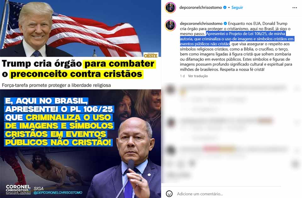 Porto Velho, RO – O deputado federal Coronel Chrisóstomo (PL-RO) apresentou recentemente o Projeto de Lei nº 106/2025, que proíbe o uso de símbolos cristãos em eventos públicos de celebração ou visibilidade LGBTQIA+. O texto prevê multas de R$ 50 mil por símbolo exposto e até três anos de suspensão de eventos em caso de reincidência. Segundo a justificativa anexada ao PL, a medida busca proteger o respeito à fé cristã e evitar o que o parlamentar considera vilipêndio de imagens religiosas.