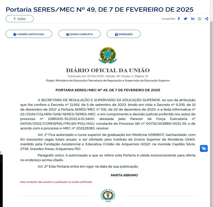 A cidade de Ariquemes e toda a Região do Vale do Jamari finalmente terão um curso de Medicina. A conquista, que era um dos maiores anseios da população, agora se tornou realidade com a publicação da Portaria SERES/MEC nº 49, de 7 de fevereiro de 2025, no Diário Oficial da União. A autorização permite que o Instituto de Ensino Superior de Rondônia, mantido pela Fundação Assistencial e Educativa Cristã de Ariquemes, ofereça o curso de Medicina com 60 vagas anuais.