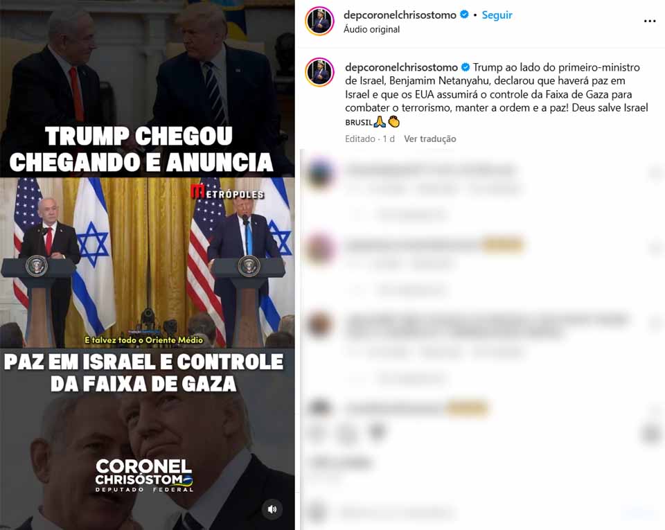 Porto Velho, RO – O deputado federal Coronel Chrisóstomo (PL-RO) celebrou a recente declaração do presidente dos Estados Unidos (EUA), Donald Trump, sobre a Faixa de Gaza. Em uma postagem nas redes sociais, o parlamentar compartilhou uma imagem do encontro entre Trump e o primeiro-ministro de Israel, Benjamin Netanyahu, acompanhada da legenda "Trump chegou chegando e anuncia paz em Israel e controle da Faixa de Gaza".