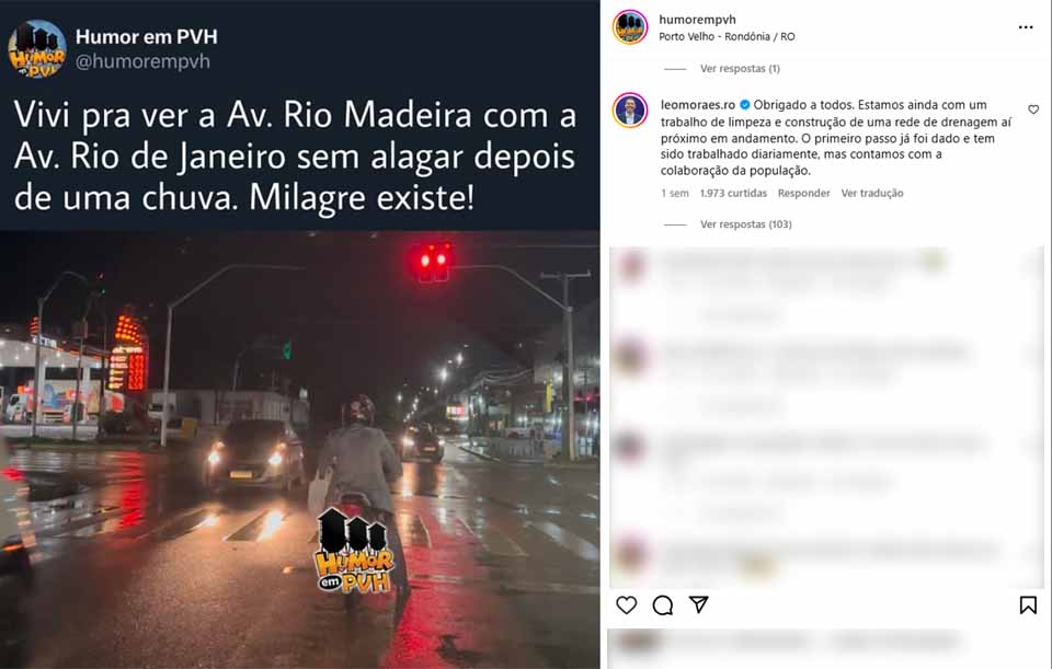 Embora fosse humanamente impossível resolver um problema estrutural complexo em tão pouco tempo, a postagem evidenciou a expectativa gerada pelo próprio discurso eleitoral, que se transformou em resultado prático em pouco tempo. Em resposta, Léo Moraes defendeu as ações emergenciais já iniciadas: “Obrigado a todos. Estamos ainda com um trabalho de limpeza e construção de uma rede de drenagem aí próximo em andamento. O primeiro passo já foi dado e tem sido trabalhado diariamente, mas contamos com a colaboração da população”.