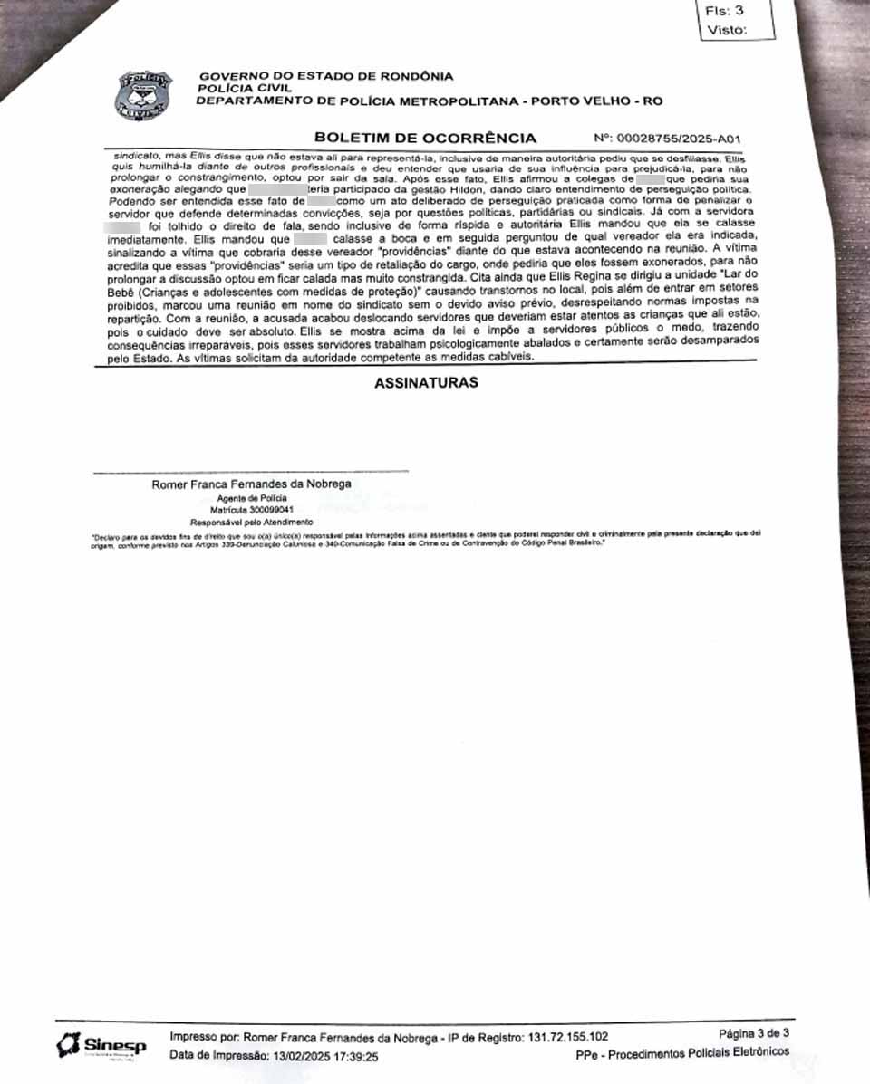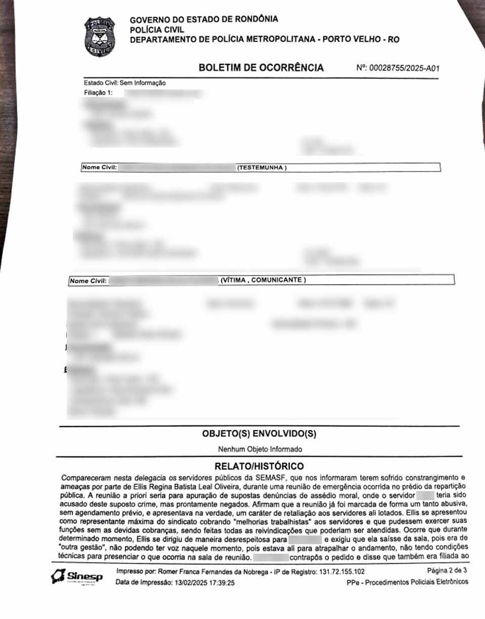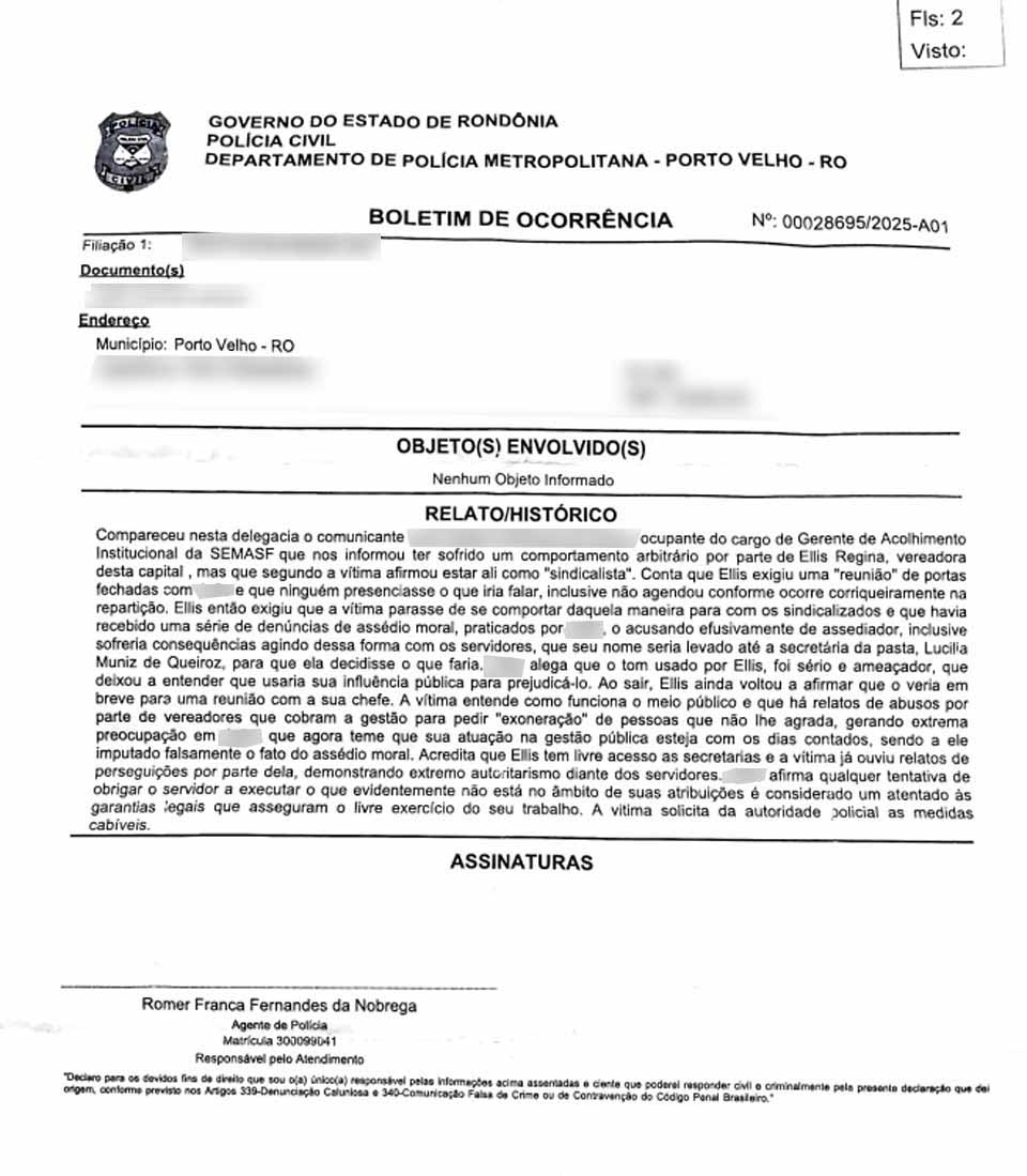 Porto Velho, RO – Um servidor público da Secretaria Municipal de Assistência Social e da Família (SEMASF) registrou um boletim de ocorrência contra a vereadora Ellis Regina Batista Leal Oliveira, a Ellis Regina, do União Brasil. Segundo os documentos lavrados na 3ª Delegacia de Polícia Civil de Porto Velho, o servidor, que ocupa o cargo de gerente de acolhimento institucional, denunciou ter sido alvo de comportamento arbitrário e perseguição por parte da parlamentar durante uma reunião na sede da repartição pública.