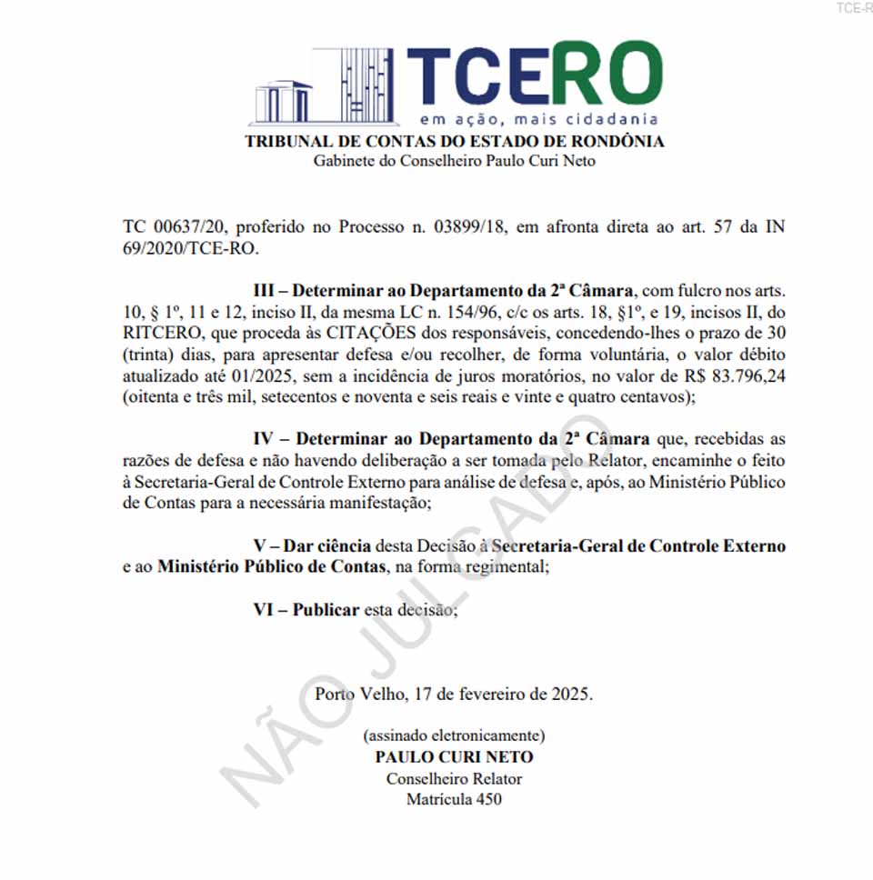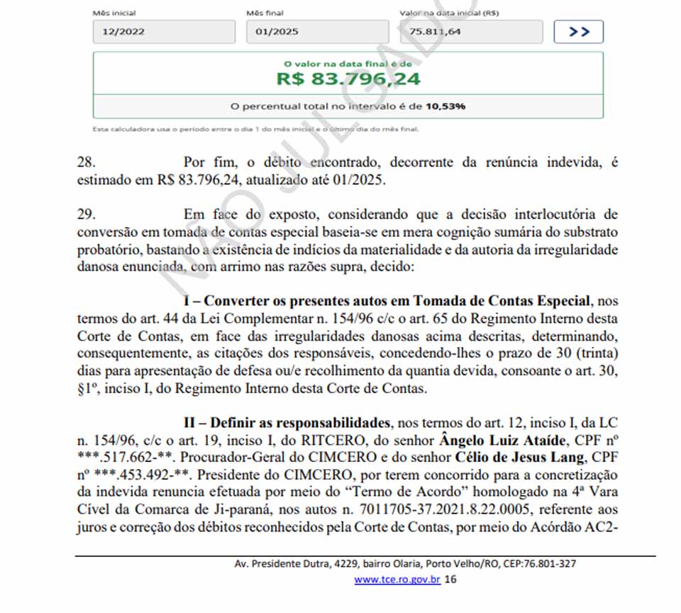 Porto Velho, RO – O Tribunal de Contas do Estado de Rondônia (TCE-RO) converteu em Tomada de Contas Especial (TCE) o processo que investiga a concessão indevida de descontos em créditos provenientes de decisões da Corte, envolvendo o Consórcio Intermunicipal da Região Centro Leste do Estado de Rondônia (CIMCERO). A decisão, proferida pelo conselheiro relator Paulo Curi Neto, atende a uma Representação formulada pelo Ministério Público de Contas (MPC-RO), que apontou indícios de dano ao erário com a homologação de um acordo judicial que isentou a cobrança de juros e atualização monetária sobre um débito imputado em decisão anterior do Tribunal.
