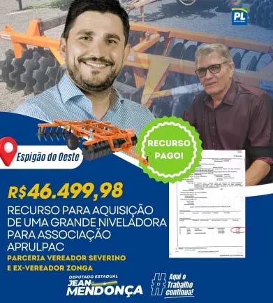 Esta semana o deputado Jean Mendonça (PL) usou de suas redes sociais para anunciar a liberação de emenda parlamentar no valor de R$46.499,98 mil reais para a aquisição de uma Grade Niveladora para atender as demandas dos associados da Associação do Produtores Rurais da Linha Pacarana (Aprulpac) em suas propriedades.