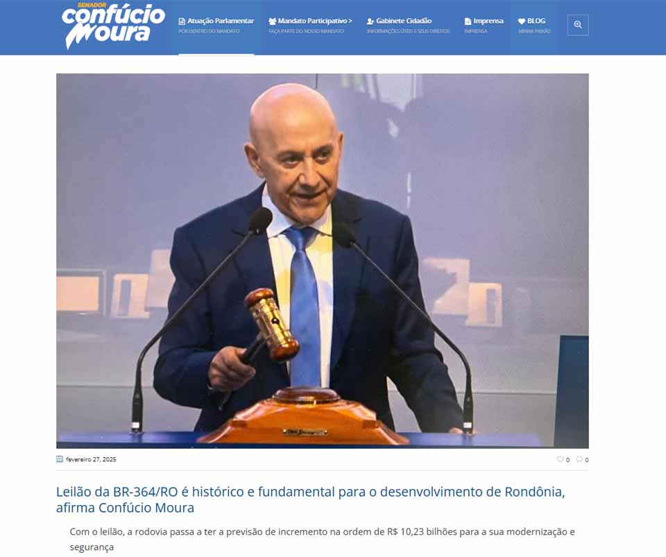 Enquanto a concessão da BR-364 foi recebida com preocupação pela maior parte dos parlamentares rondonienses, que apontam riscos ao setor produtivo e impactos diretos no custo de vida da população, Confúcio Moura foi na contramão das críticas. Em publicações nas redes sociais e em declarações oficiais, o senador fez questão de exaltar o leilão, tratando o evento como um marco histórico e reafirmando sua confiança nos investimentos privados.