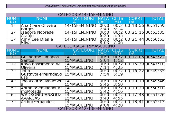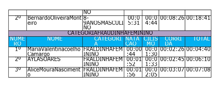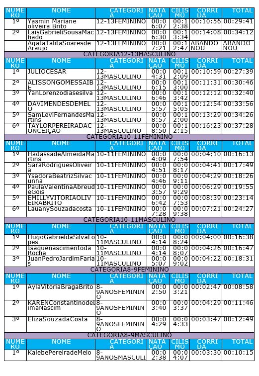 No feminino, categoria de 8 a 9 anos, o primeiro lugar ficou para Ayla Vitória Braga Brito, com Karen Constantino de Lima Nascimento em segundo lugar. No masculino, 10-11 anos, Hugo Gabriel da Silva Lopes cruzou a linha de chegada em primeiro, seguido de Isaque Nascimento da Rocha.