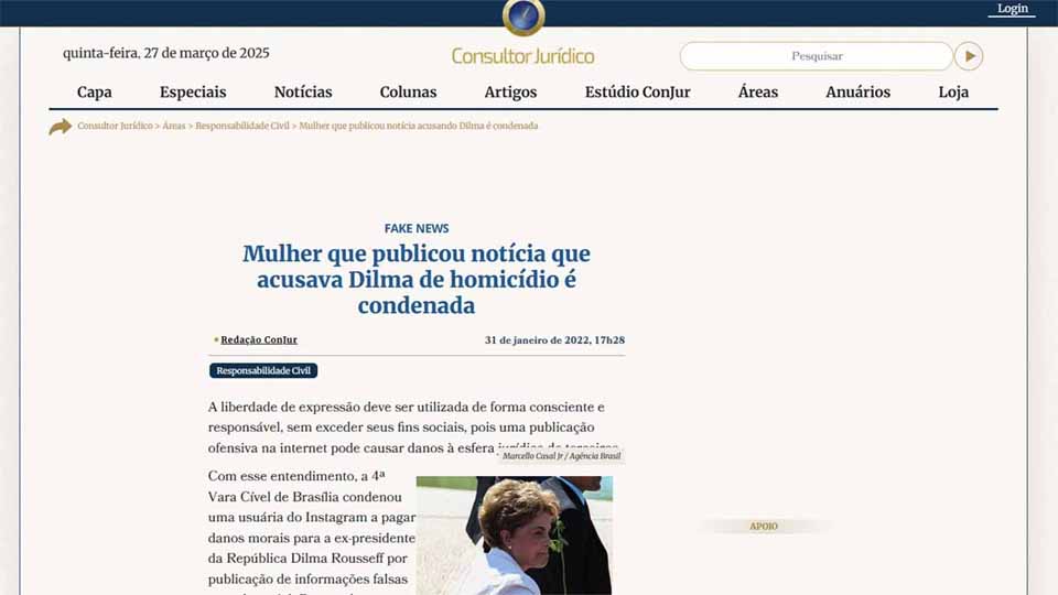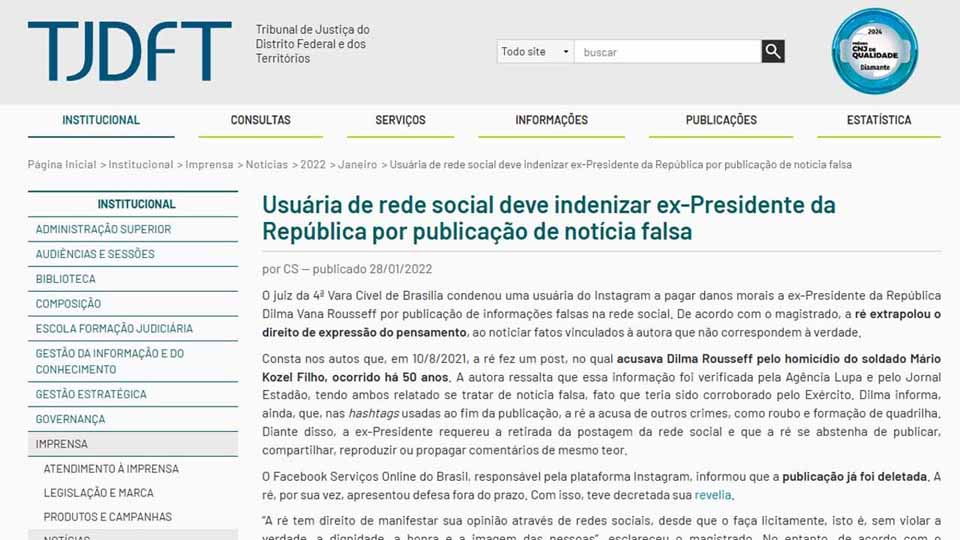 Além das checagens jornalísticas, o Judiciário também já se manifestou sobre o tema. Em decisão da 4ª Vara Cível de Brasília, proferida há três anos, uma usuária do Instagram foi condenada a pagar R$ 30 mil em indenização à ex-presidente por compartilhar conteúdo falso, afirmando que Dilma teria assassinado o soldado Kozel Filho. O processo reconheceu que a publicação ultrapassou os limites da liberdade de expressão, ao propagar acusações infundadas e sensacionalistas.
