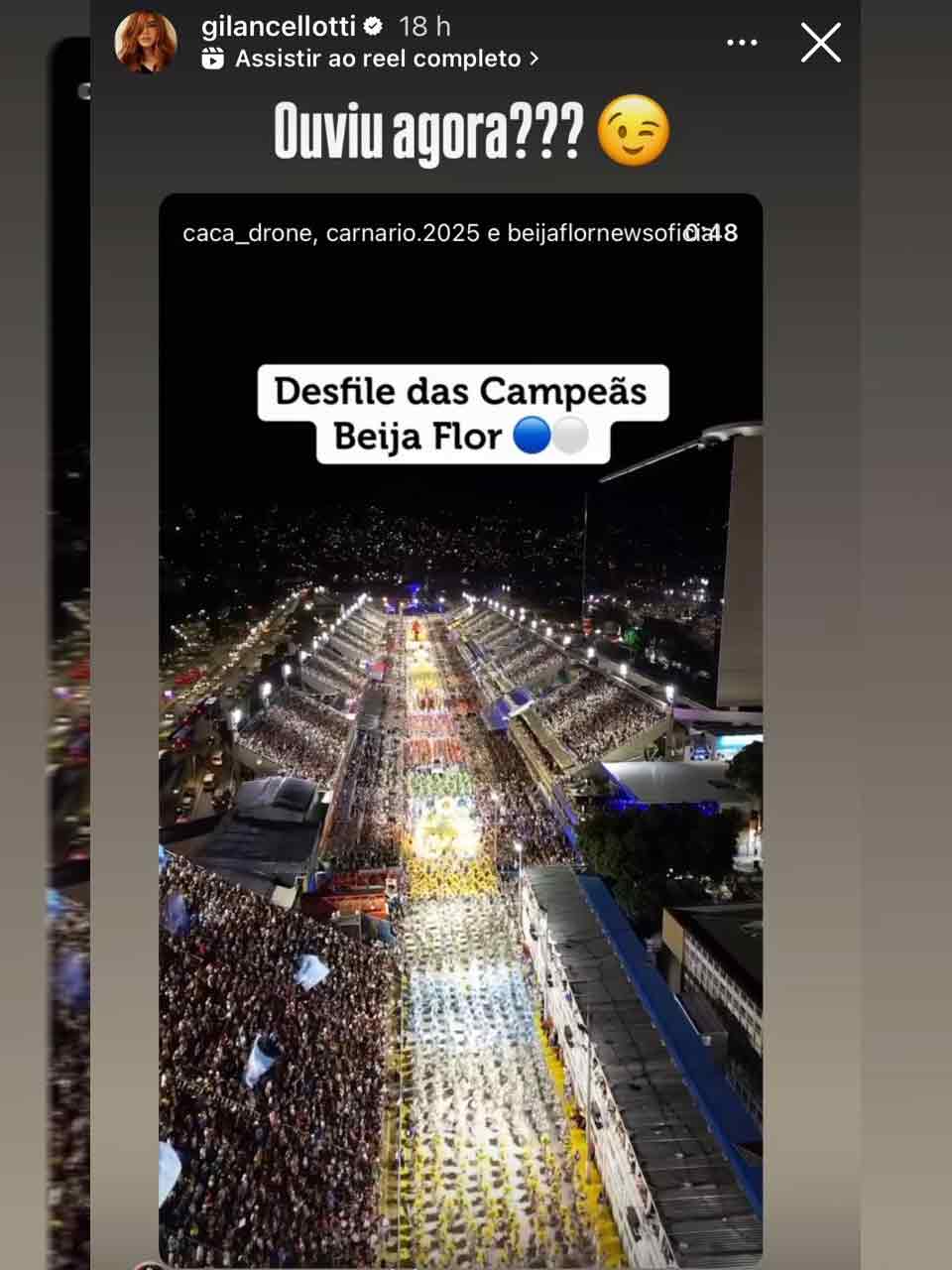 Lancellotti, então, compartilhou um vídeo da Passarela do Samba cantando o samba-enredo da escola de Nilópolis, e escreveu na legenda: “Ouviu agora?” – seguida de um emoji piscando e sorrindo.