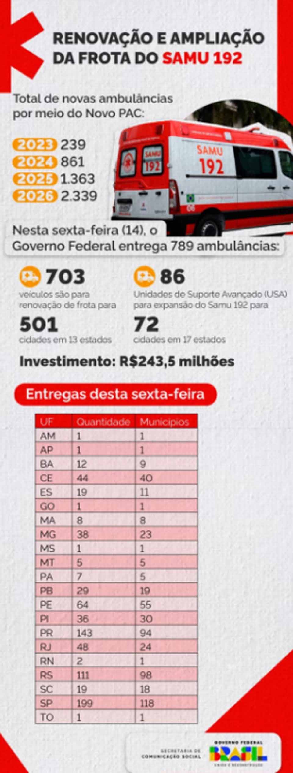 RENOVAÇÃO — Os 789 veículos vão chegar a 559 municípios de 21 estados, com investimento total de R$ 243,5 milhões por meio do Novo PAC. Entre os veículos, 703 são para renovação da frota de 501 cidades em 13 estados. Cada um custou R$ 289 mil, totalizando R$ 203,1 milhões. Outras 86 Unidades de Suporte Avançado (USA), conhecidas como UTIs Móveis, são para expansão do Samu 192 em 72 cidades de 17 estados. Cada uma teve investimento de R$ 469,8 mil, em um total de R$ 40,4 milhões.