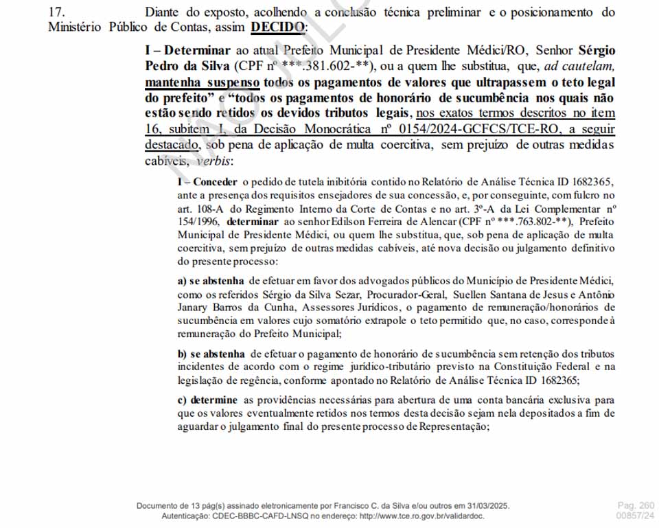 Porto Velho, RO – O prefeito de Presidente Médici, Sérgio Pedro da Silva, o Sérgio do Skinão, do PL, terá de manter suspensos todos os pagamentos de honorários de sucumbência que ultrapassem o teto salarial do chefe do Executivo municipal e, também, aqueles feitos sem a retenção de tributos obrigatórios, como Imposto de Renda e contribuição previdenciária. A determinação é do conselheiro Francisco Carvalho da Silva, do Tribunal de Contas do Estado de Rondônia (TCE-RO), e está registrada na Decisão Monocrática nº 0154/2024, publicada em 31 de março.