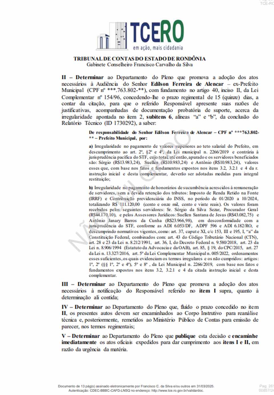 A decisão ainda prevê que o ex-prefeito Edilson Ferreira de Alencar apresente defesa no prazo de 15 dias a partir de sua citação, podendo, inclusive, ser responsabilizado solidariamente por danos ao erário em caso de descumprimento das determinações anteriores.