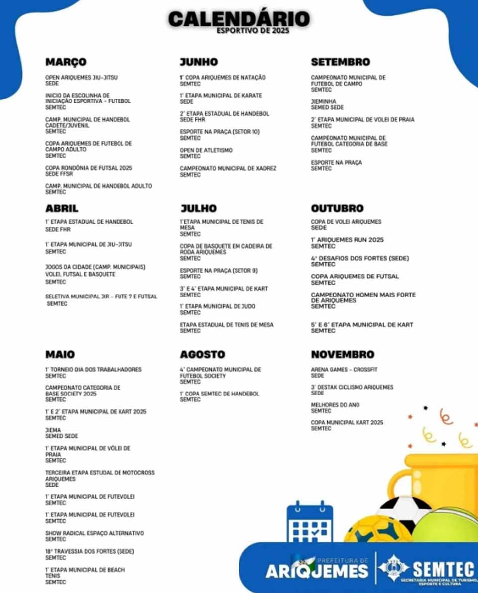 A Prefeitura de Ariquemes, por meio da Secretaria Municipal de Turismo, Esporte e Cultura - SEMTEC divulgou o calendário de competições esportivas para 2025.