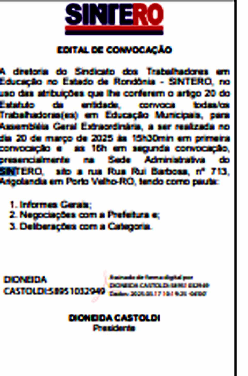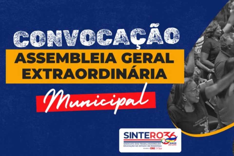 A regional Norte do Sindicato dos Trabalhadores e Trabalhadoras em Educação no Estado de Rondônia (SINTERO) convoca as/os profissionais da educação municipais para a Assembleia Geral Extraordinária, que será realizada no dia 20 de março de 2025, no auditório da sede administrativa do SINTERO, localizado na Rua Rui Barbosa, nº 713, Arigolândia, em Porto Velho. A primeira convocação ocorrerá às 15h30, e a segunda, às 16h.