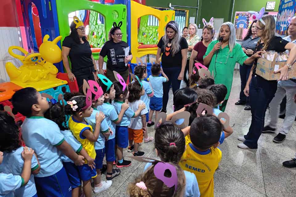 Na manhã desta terça-feira (15), a equipe da Biblioteca Municipal Francisco Meirelles esteve na escola Pequeno Polegar, na capital, onde promoveram atividades do projeto “Páscoa na Biblioteca”, que contou com a participação de 40 crianças. Contação de história, pintura no rosto e distribuição de sacolinhas com bombons e chocolates fizeram parte desta ação. As atividades também acontecem no período da tarde com a mesma equipe e programação.