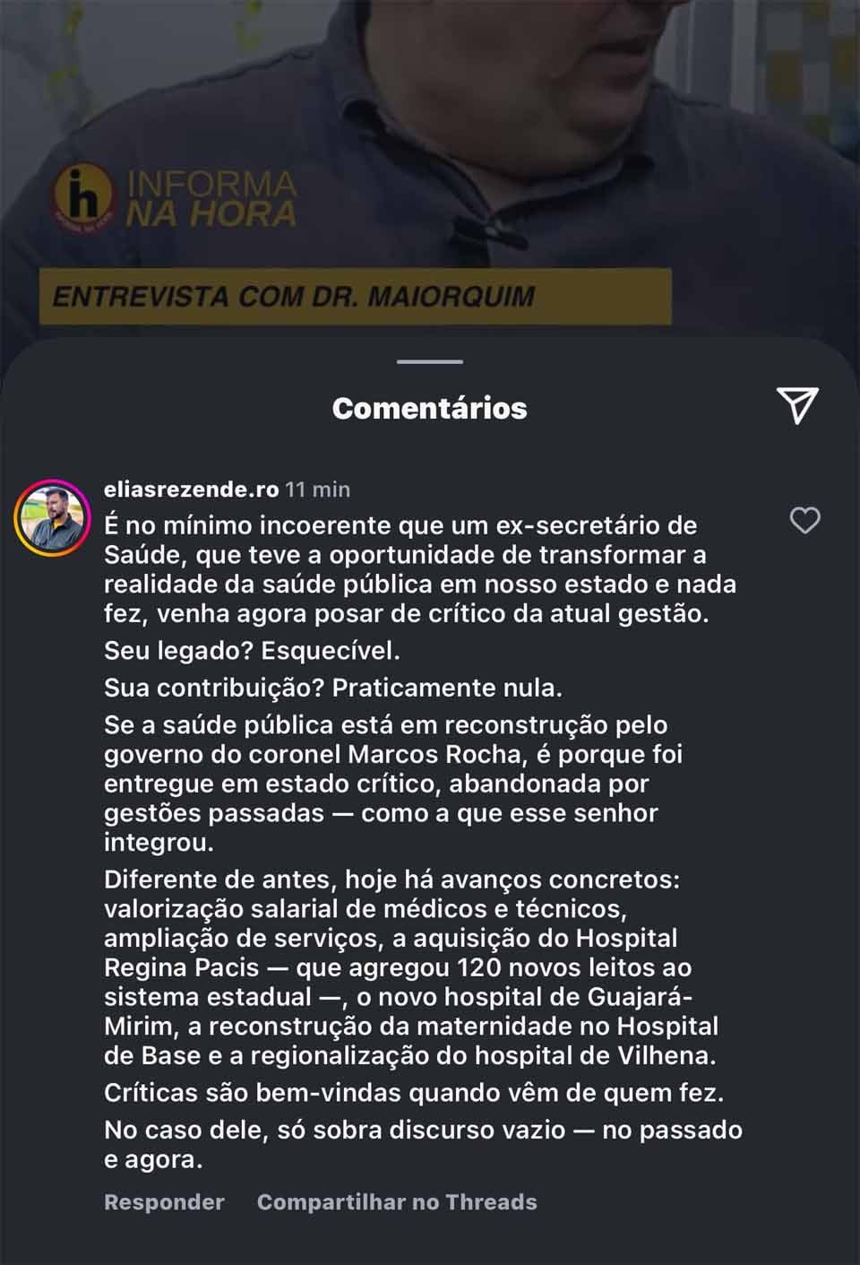 Porto Velho, RO – Um comentário publicado no Instagram pelo secretário-chefe da Casa Civil, Elias Rezende, repercutiu no meio político e médico de Rondônia. Ele reagiu publicamente às críticas feitas pelo médico Luis Eduardo Maiorquin, atual presidente do Sindicato Médico de Rondônia (Simero), direcionadas à atual política de gestão da saúde pública no estado.