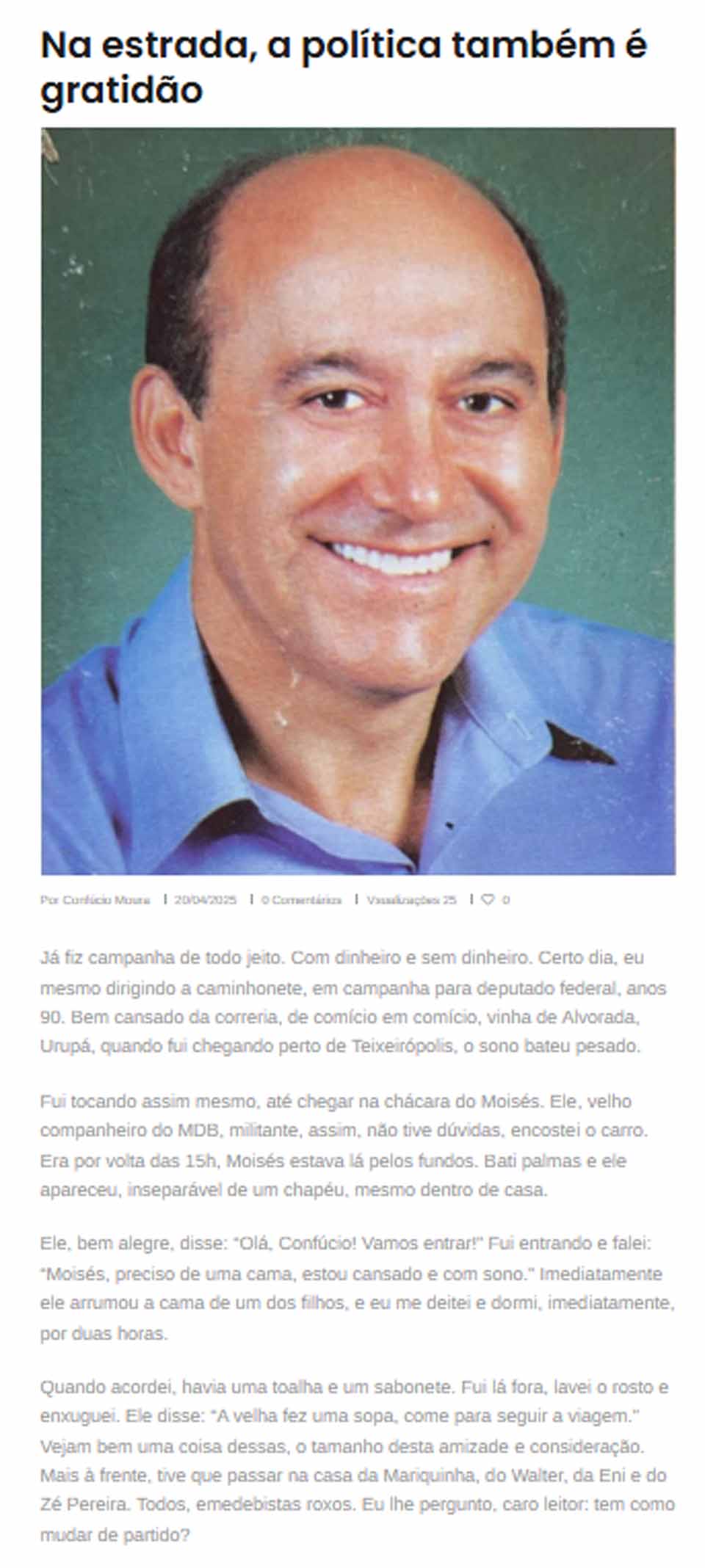Porto Velho, RO – Em texto publicado no último domingo, 20 de abril de 2025, o ex-governador de Rondônia e senador da República Confúcio Moura, do MDB, compartilhou uma lembrança pessoal de campanha eleitoral vivida nos anos 1990. O relato, intitulado “Na estrada, a política também é gratidão”, narra um episódio ocorrido durante sua candidatura a deputado federal, destacando o acolhimento recebido de militantes históricos do partido no interior do estado.