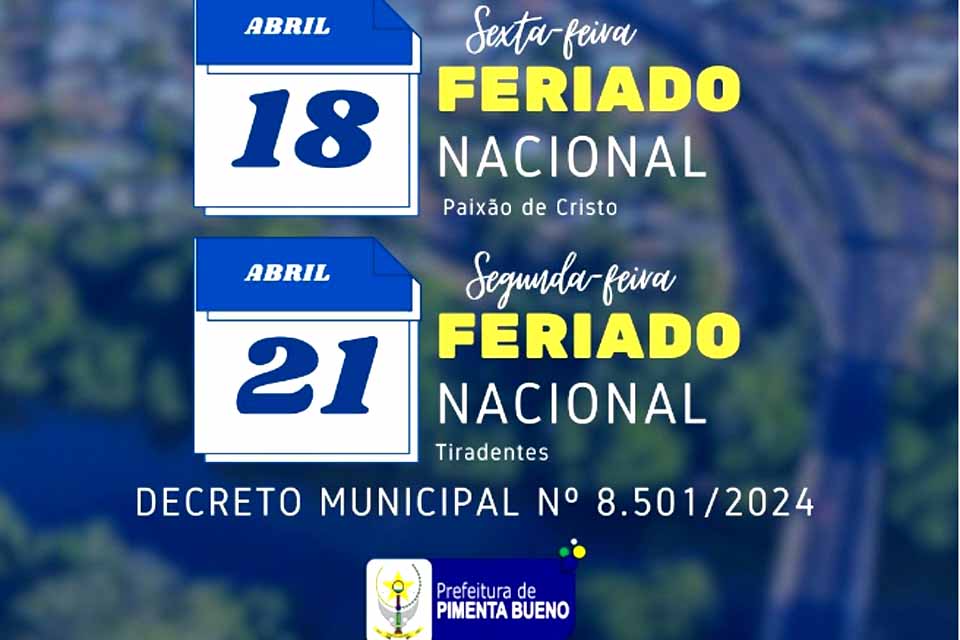 De acordo com o Decreto Municipal nº 8.501/2024 e o Decreto Estadual nº 29.900/2024 , a quinta-feira, 17 de abril, será ponto facultativo em razão da Semana Santa. Já a sexta-feira, 18 de abril, é feriado nacional de Paixão de Cristo . E a segunda-feira, 21 de abril, também será feriado nacional, em comemoração ao Dia de Tiradentes.