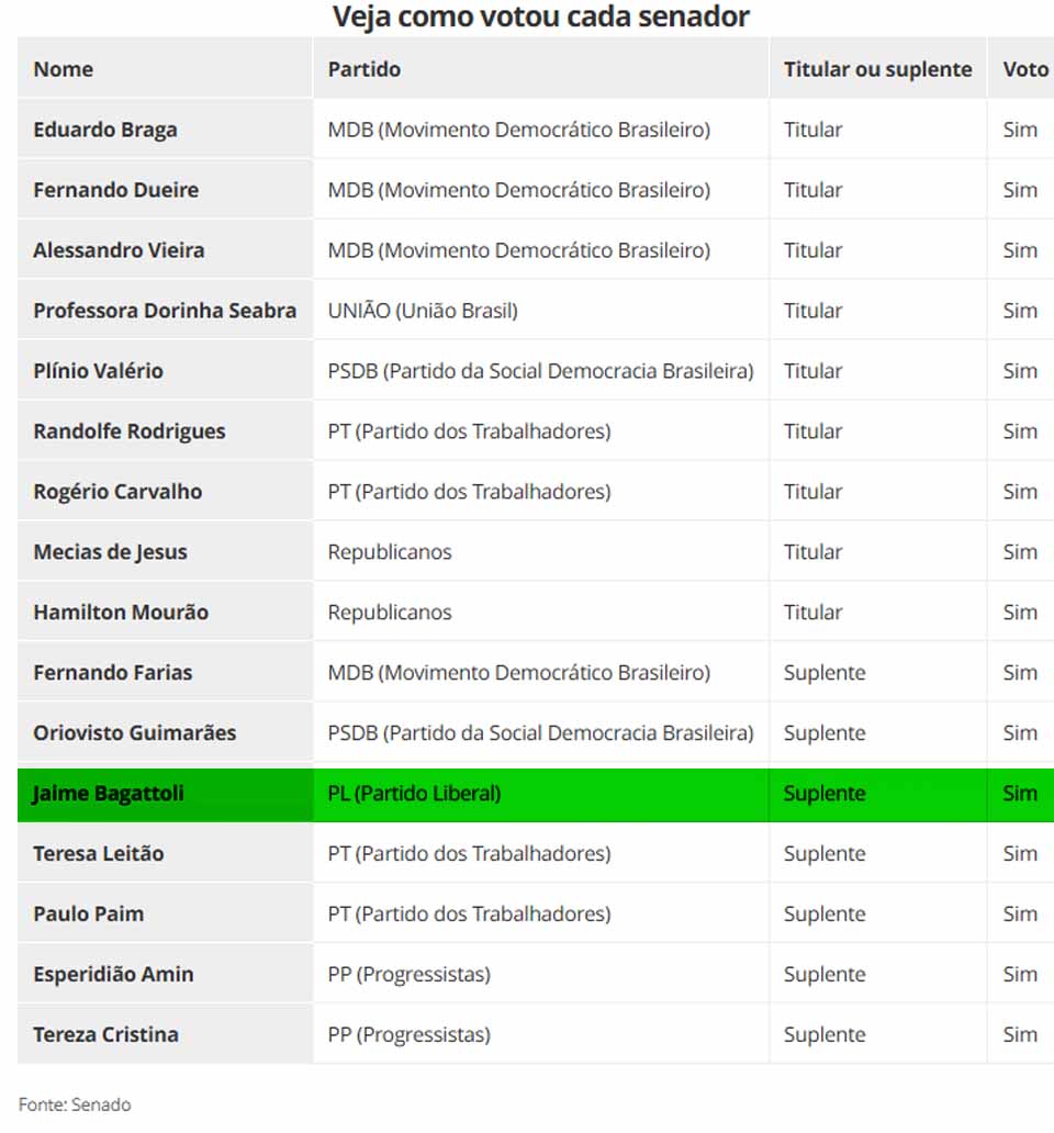A votação no Senado contou com 70 votos favoráveis e nenhum contrário. Além de Bagattoli, outros senadores da base bolsonarista, como Luís Carlos Heinze (PP-RS), Jorge Seif (PL-SC) e Jayme Campos (União-MT), também votaram a favor da proposta. Para o presidente da Comissão de Assuntos Econômicos (CAE), senador Renan Calheiros (MDB-AL), o projeto reafirma o princípio da reciprocidade como base da diplomacia comercial brasileira.