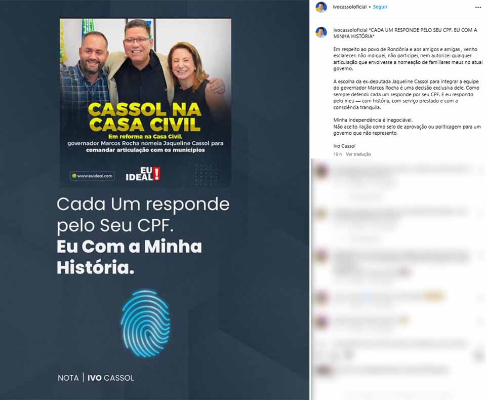 A nova nomeação também gerou reação imediata. Na última quarta-feira, 23, Ivo Cassol publicou uma nota pública intitulada “Cada um responde pelo seu CPF. Eu com a minha história.” No comunicado, tentou se desvincular da escolha: “Não indiquei, não participei, nem autorizei qualquer articulação que envolvesse a nomeação de familiares meus no atual governo.” Disse ainda não aceitar ser associado a decisões de um governo que não representa.