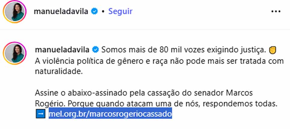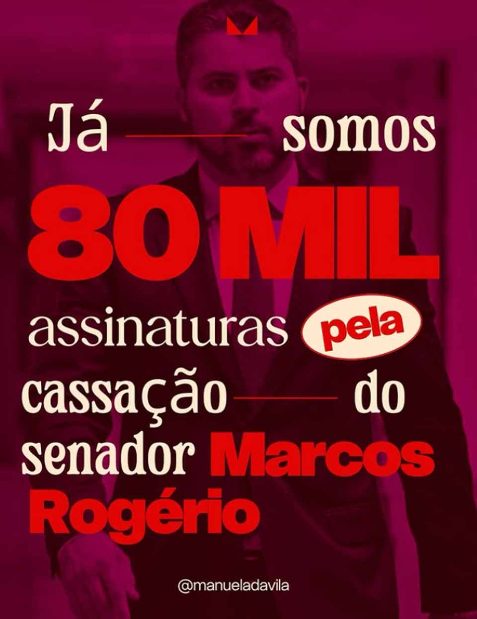 Porto Velho, RO – A iniciativa da ex-deputada Manuela D’Ávila (concorreu como vice de Fernando Haddad, do PT, nas eleições presidenciais de 2018) para cassar o mandato do senador Marcos Rogério (PL-RO) ganhou força nas últimas 24 horas. Com base em acusações de violência política de gênero e raça contra a ministra do Meio Ambiente, Marina Silva, um abaixo-assinado online lançado pela organização Mulheres Em Luta (MEL) ultrapassou 80 mil assinaturas, conforme publicação nas redes sociais da idealizadora.