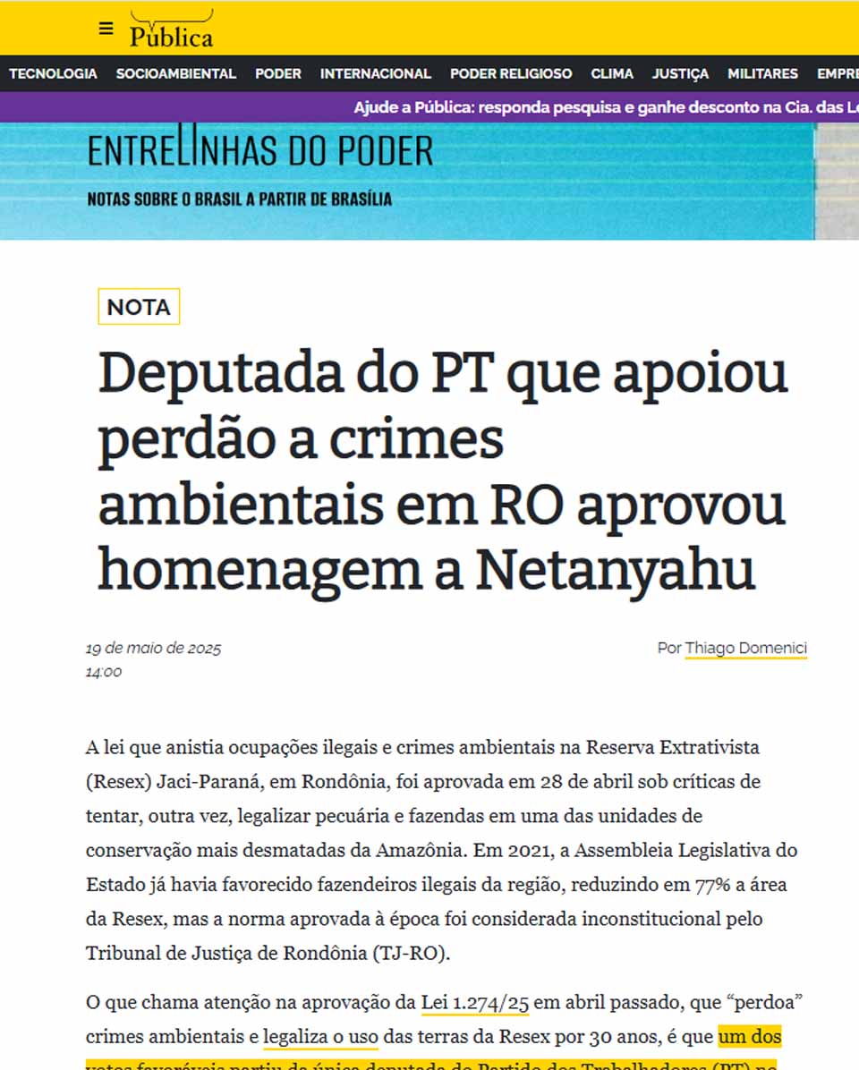 As posições da deputada contrastam com a postura do PT nacional, que tem se posicionado contra anistias a crimes ambientais e criticado ações do governo israelense. A atuação de Cláudia de Jesus tem sido vista como um afastamento das diretrizes do partido, causando incômodo entre lideranças petistas .